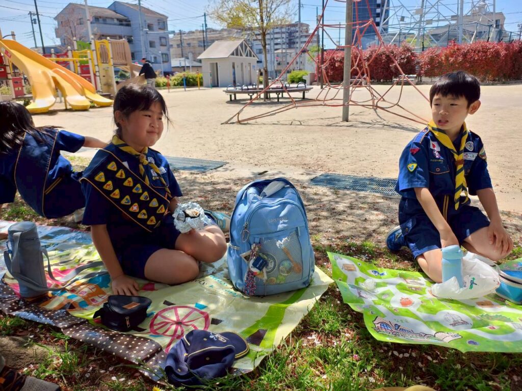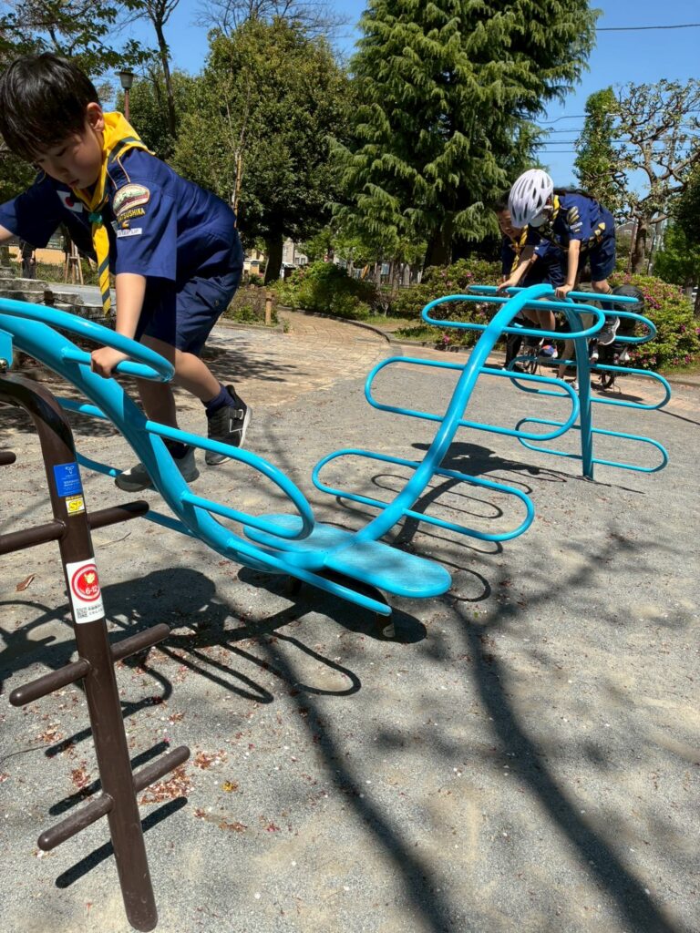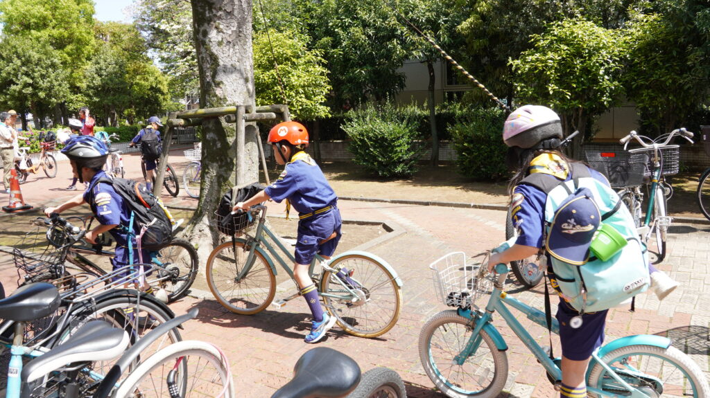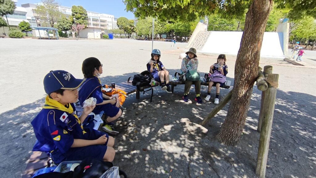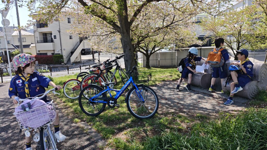 4月12日の集会では、「ぼくら公園ちょうさ隊」として、組ごとに自転車で地域の公園をめぐる活動を行いました。集会のはじめには、新任の次長の任命もあり、あらためて「組」で助け合って動くことや、それぞれの役割を意識する時間も持ちました。