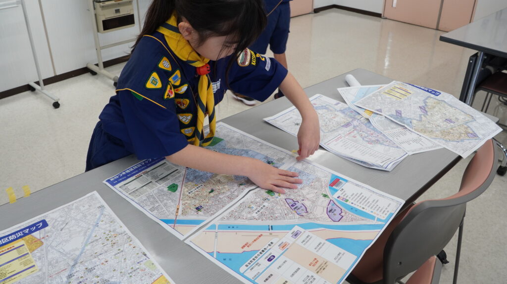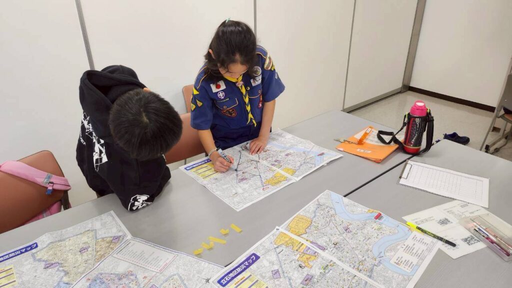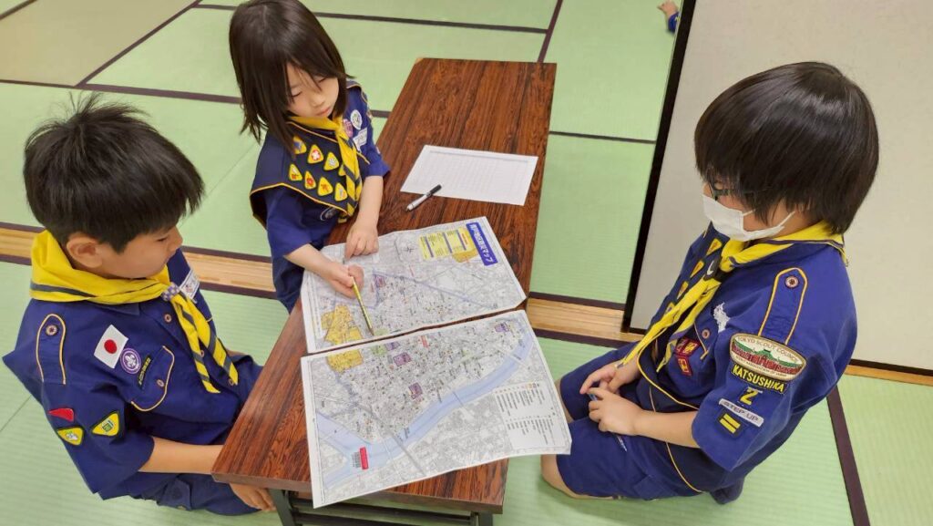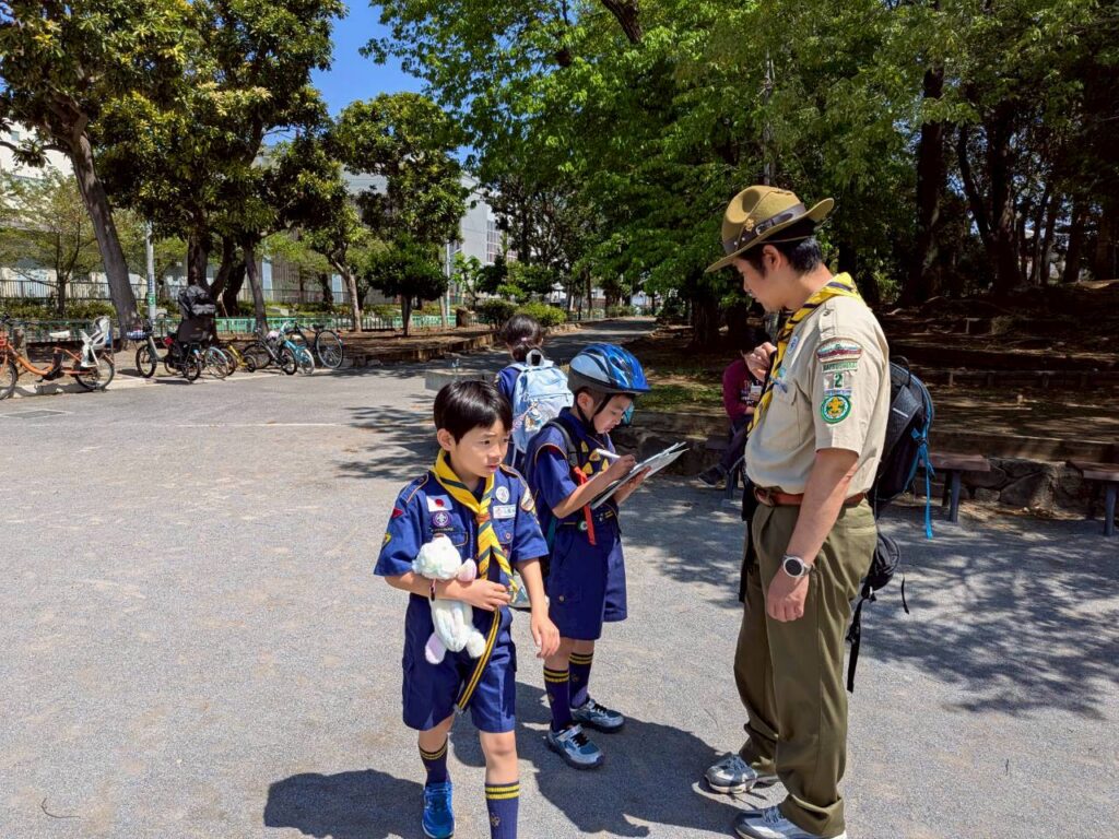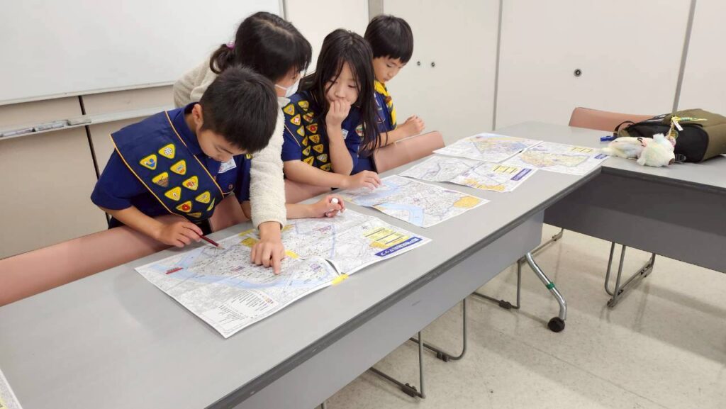 その後は地図を配布し、「どんなルートで行こうか」「どの公園を回ろうか」を組ごとに相談しました。スカウトたちは意見を出し合いながら作戦を立て、組で協力して出発しました。