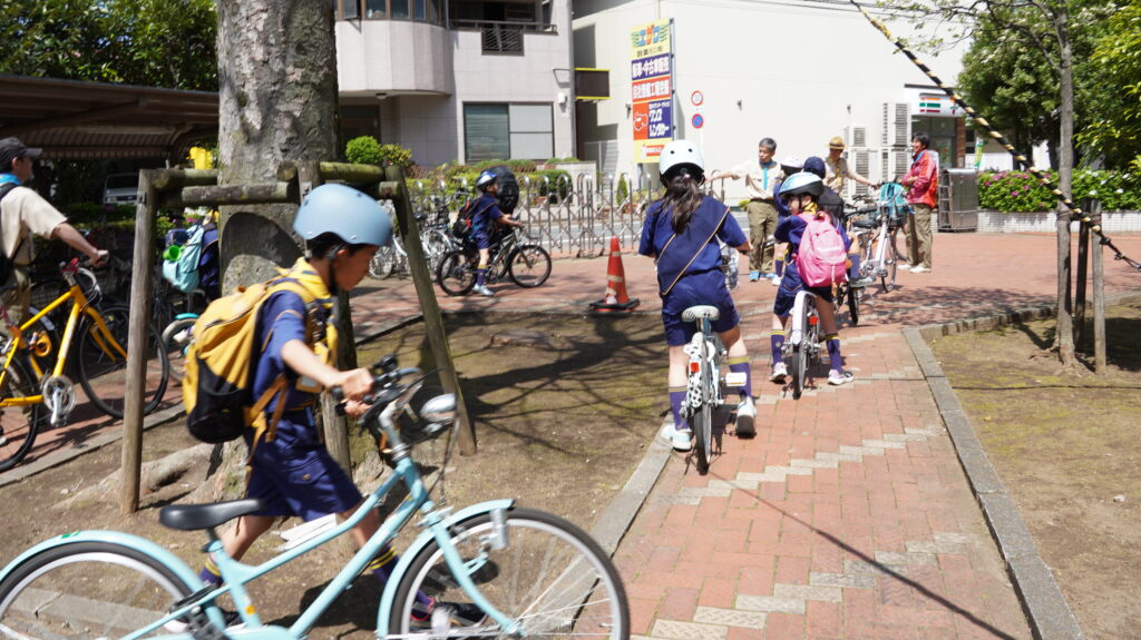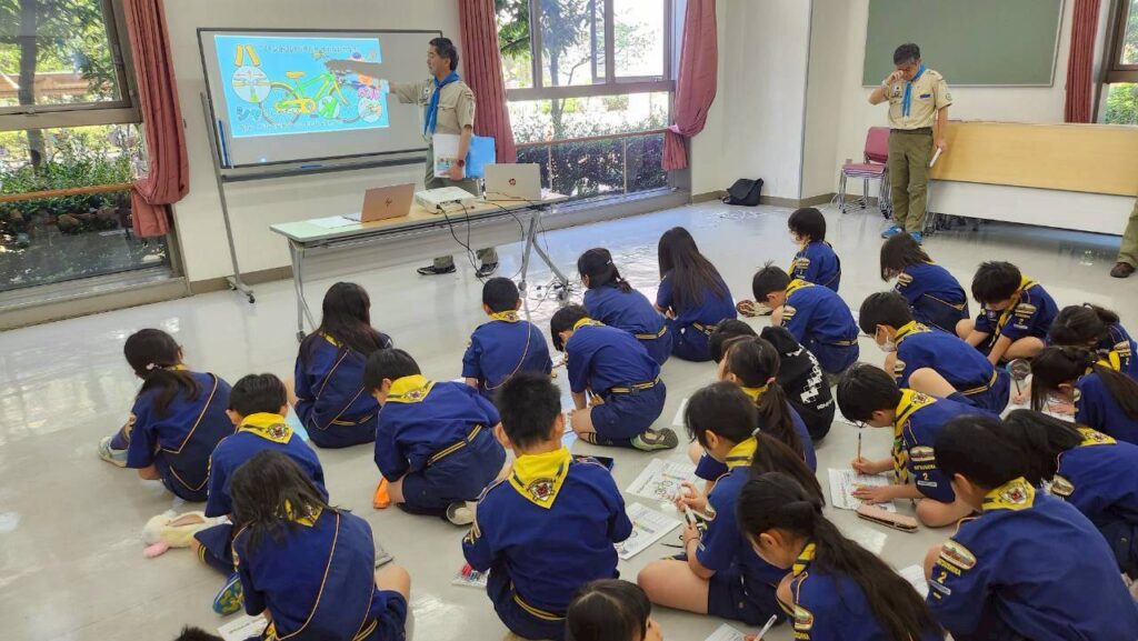 また、出発前にはチャレンジ章「自転車博士」に関わる学習として、自転車の各部の名前や手入れ、自転車に乗るときの安全規則や道路標識について学びました。安全に自転車に乗るための基本を、みんなで確認してから活動に出発しました。