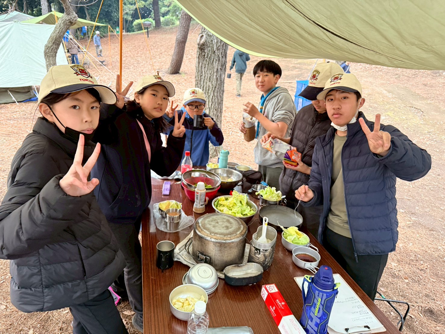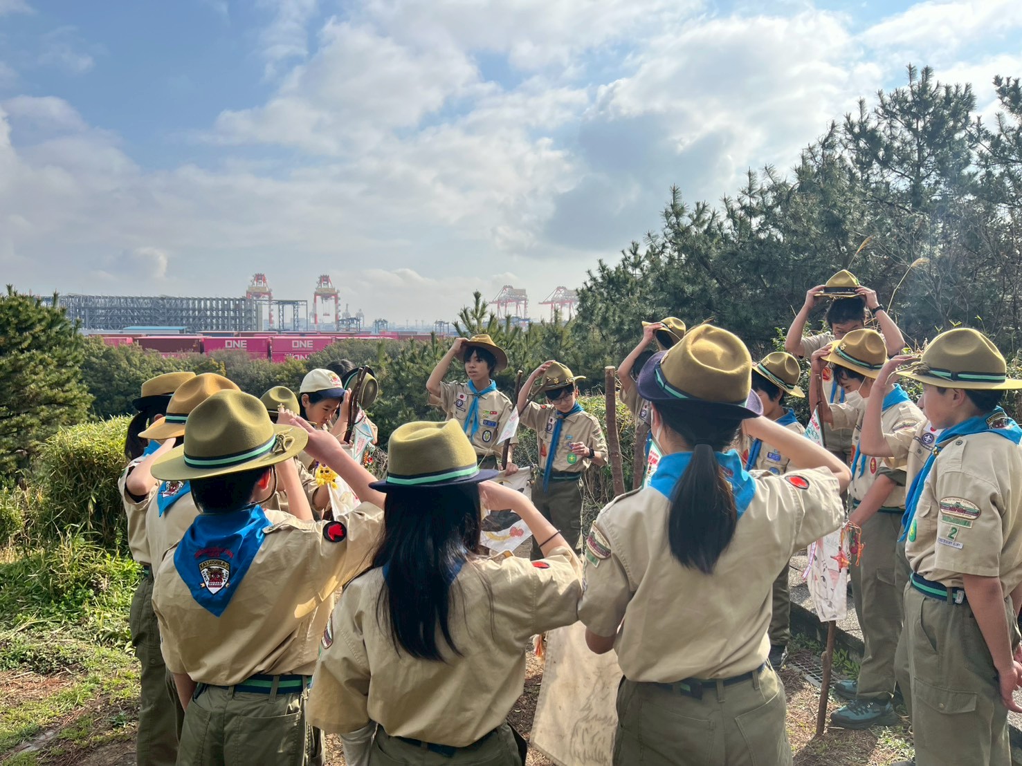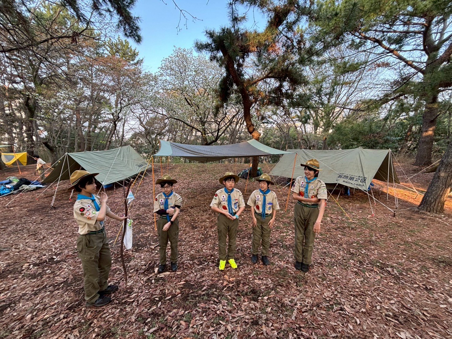 今回の春キャンプは、羽田空港が近くのみなとが埠頭キャンプ場で行いまいした。班対抗での班旗立てや火おこし対決を行ったり、飛行機が間近に見える城南島海浜公園までのハイキングを行いました。朝は雨上がりで肌寒かったですが、日中は快晴で次々と来る飛行機を見ながら、海までのハイクを楽しみました夜は皆で火を囲んで焼いたマシュマロはとっても美味しくかったようです9月から上進したスカウト達も、テントの設営や野外炊事もかなり慣れてきました!
